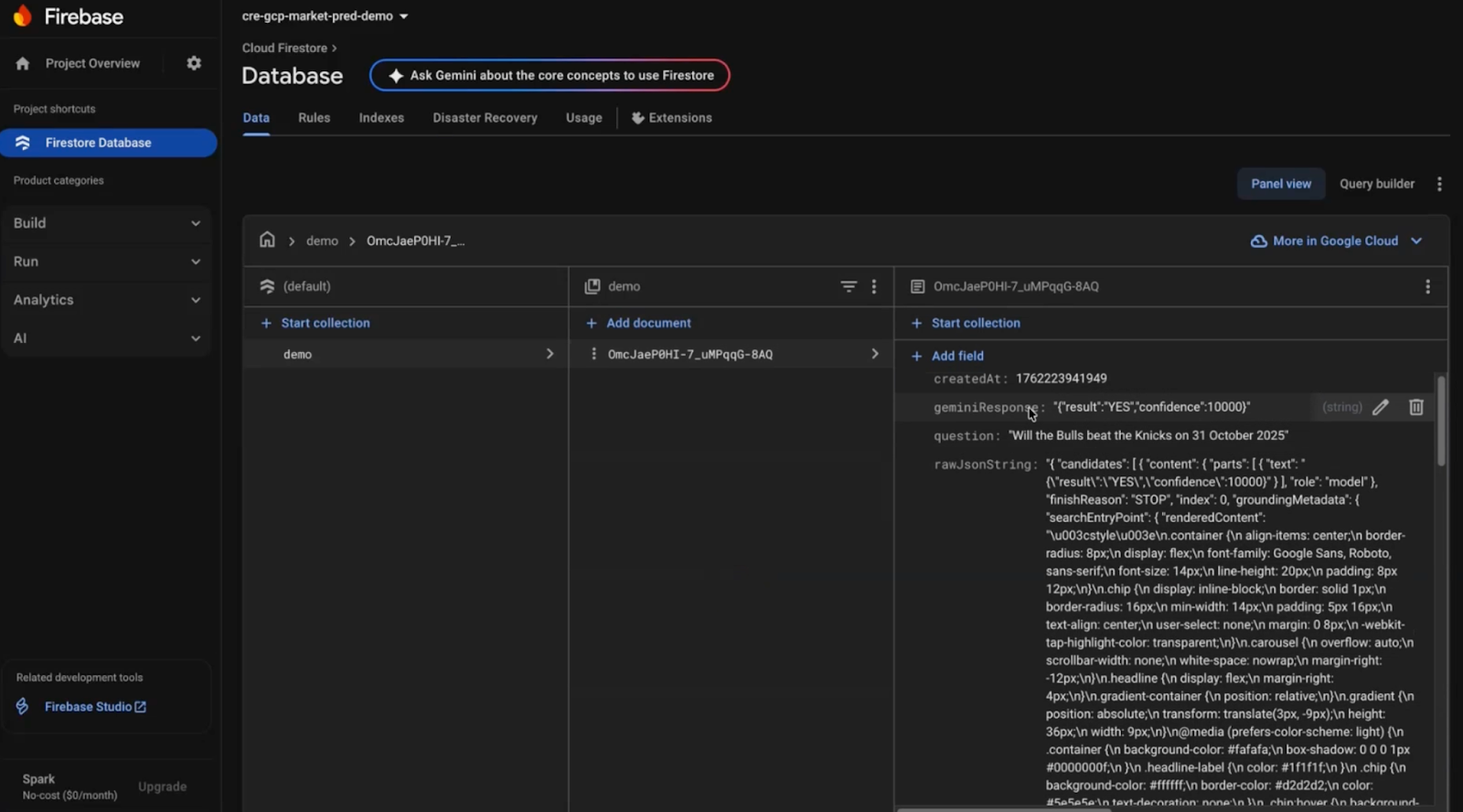 Finally, the workflow logs the AI output, confidence score, and transaction hash to Google Firestore. This provides an audit trail and allows frontends or dashboards to visualize market settlements in real time.