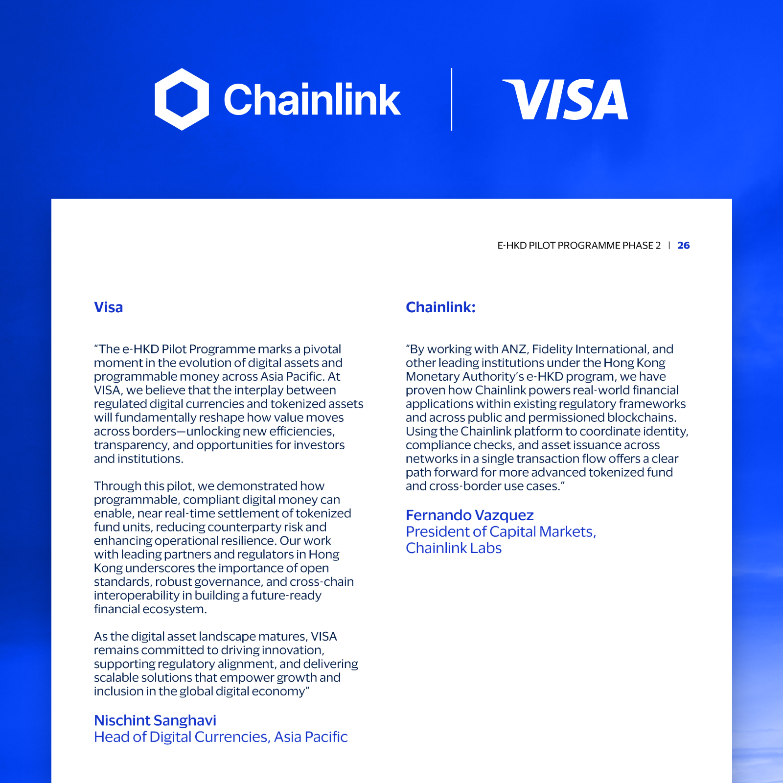 In its June 2025 report, Visa highlighted Chainlink’s work with ANZ Bank and Fidelity International under phase 2 of the Hong Kong Monetary Authority’s e-HKD program.