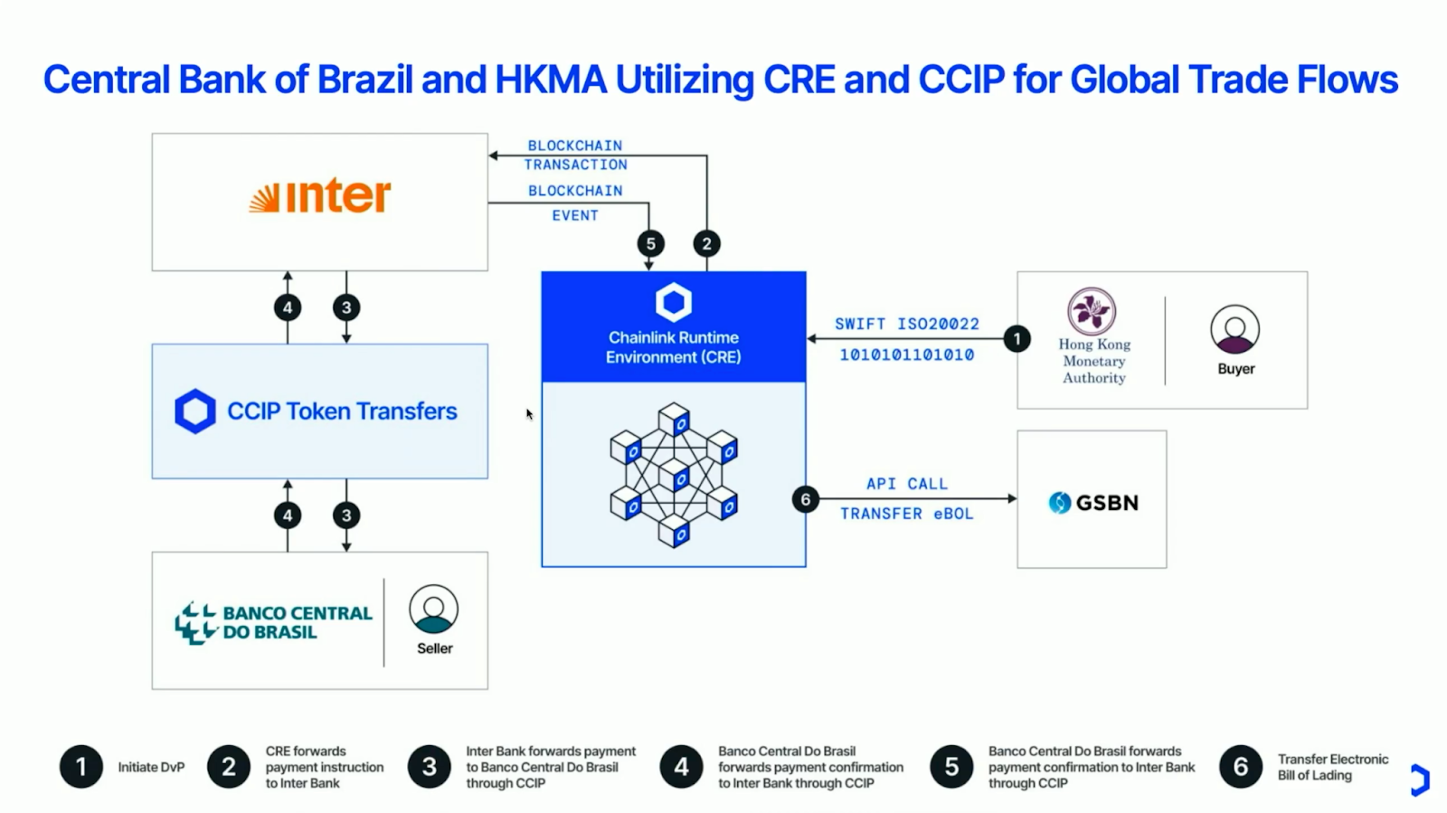 - The Central Bank of Brazil and Hong Kong Monetary Authority alongside Banco Inter, Standard Chartered, GSBN, and 7COMm partnered with Chainlink in the Drex program to power the first cross-border, cross-chain trade Experiment between BCB and HKMA. Powered end-to-end by Chainlink, the DvP model automatically escrows and releases funds while transferring the eBL, removing the need for manual coordination between banks, platforms, and shipping parties.